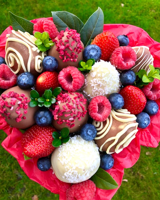 A dozen of fresh strawberries (8 of them in Belgian chocolate), ripe raspberries and blueberries are in wooden heart shape box.